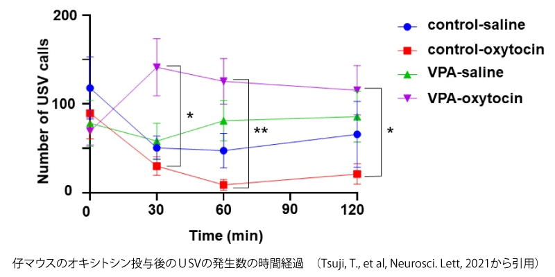 連合大学院小児発達学研究科金沢校(金沢大学子どものこころの発達研究センター)の辻知陽と辻隆宏は、バルプロ酸 (VPA)誘発自閉症モデル仔マウスを用いて、幼少期オキシトシン投与が社会性に与える影響を解析している。以前の研究で、母仔間のコミュニケーションの指標である仔マウスの超音波発声(USV)を用いて一過性のオキシトシン効果を検討し、VPAにより減少したUSVの発生数が回復することを示した。今回、USVのパターン変化を長時間分析したところ、生理食塩水(saline)を投与したコントロール群と比較して、オキシトシン投与群では発生数、複雑なコールパターンが共に増加し、120分まで持続することが明らかになった。この結果より、オキシトシン投与によりVPA誘発自閉症モデルマウスの感覚モダリティが向上することが示唆された。本研究成果は、 2021年7月27日付で学術専門誌 Neuroscience Lettersに掲載・発表された。