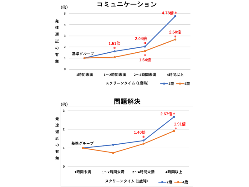 テレビやDVDなどの視聴時間、スクリーンタイムの子どもの発達との関連が懸念される中、その関連が子どものいずれの発達領域と特異的なものなのかは明らかではありませんでした。 東北大学東北メディカル・メガバンク機構の栗山進一教授、小原拓准教授、東北大学大学院医学系研究科の髙橋一平大学院生、浜松医科大学の土屋賢治特任教授、西村倫子特任講師らの研究グループは、東北メディカル・メガバンク計画三世代コホート調査に参加している7,097名の子どもを対象に、1歳時のスクリーンタイムと2歳時および4歳時の5つの発達領域における発達特性との関連を調査しました。 その結果、スクリーンタイムの長さと、2歳時および4歳時点でのコミュニケーション領域および問題解決領域の発達の遅れと特異的に関連していました。これは、デジタルデバイスの普及が加速している現代において、スクリーンデバイスの使用と子どもの発達領域の関連を示した新しい視点の研究です。 この研究成果は、小児科学の専門誌「JAMA Pediatrics」誌に掲載されました。