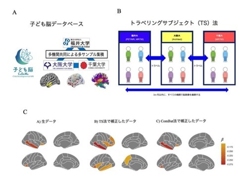 こうした背景を受けて、福井大学子どものこころの発達研究センターの寿秋露特命助教、山下特命助教、水野賀史准教授、千葉大学子どものこころの発達教育研究センターの平野好幸教授、大阪大学大学院連合小児発達学研究科の下野九理子教授らの研究グループは、ADHDの子どもを含むMRIデータを多数集めた「子ども脳」データベース(図A)を構築し、さらに、MRI機器ごとの差を補正する新たな手法である「トラベリングサブジェクト(TS)法」(図B)を導入しました。このTS法を用いて、定型発達児178名とADHD児116名の脳画像を比較したところ、ADHDの子どもでは前頭側頭領域、とくに右の中側頭回で、脳の体積が小さいことが明らかになりました(図C)。
