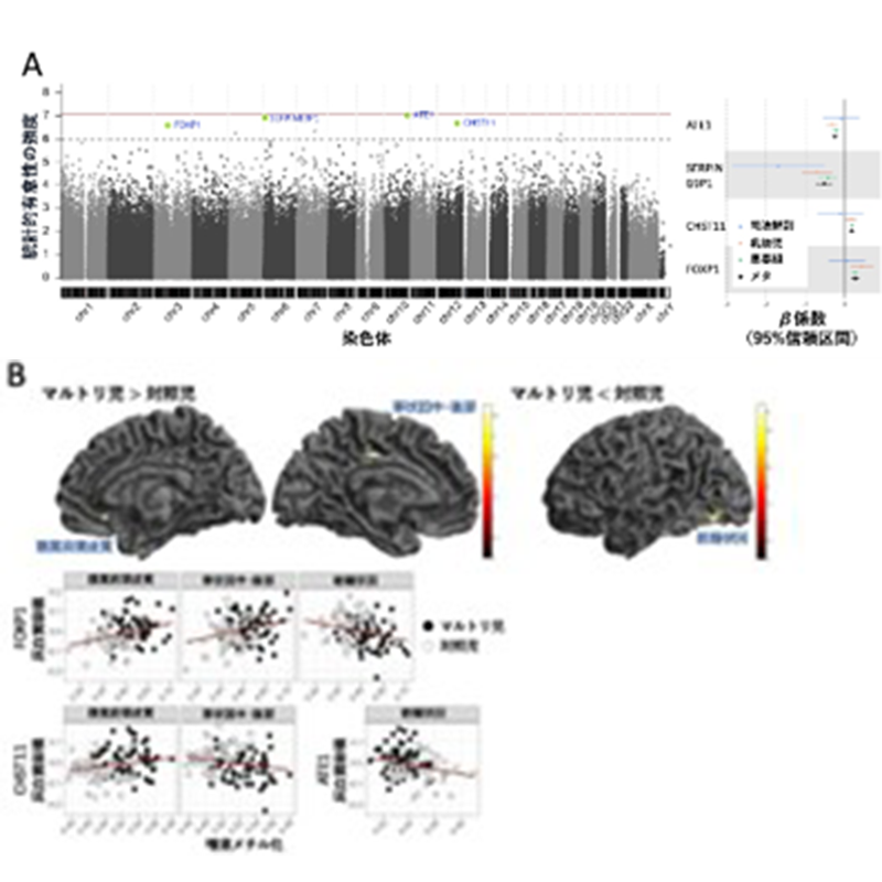 図B: 全脳灰白質容積の比較(VBM)とDNAメチル化:FOXP1・CHST11・ATE1遺伝子と脳の構造変化の関係