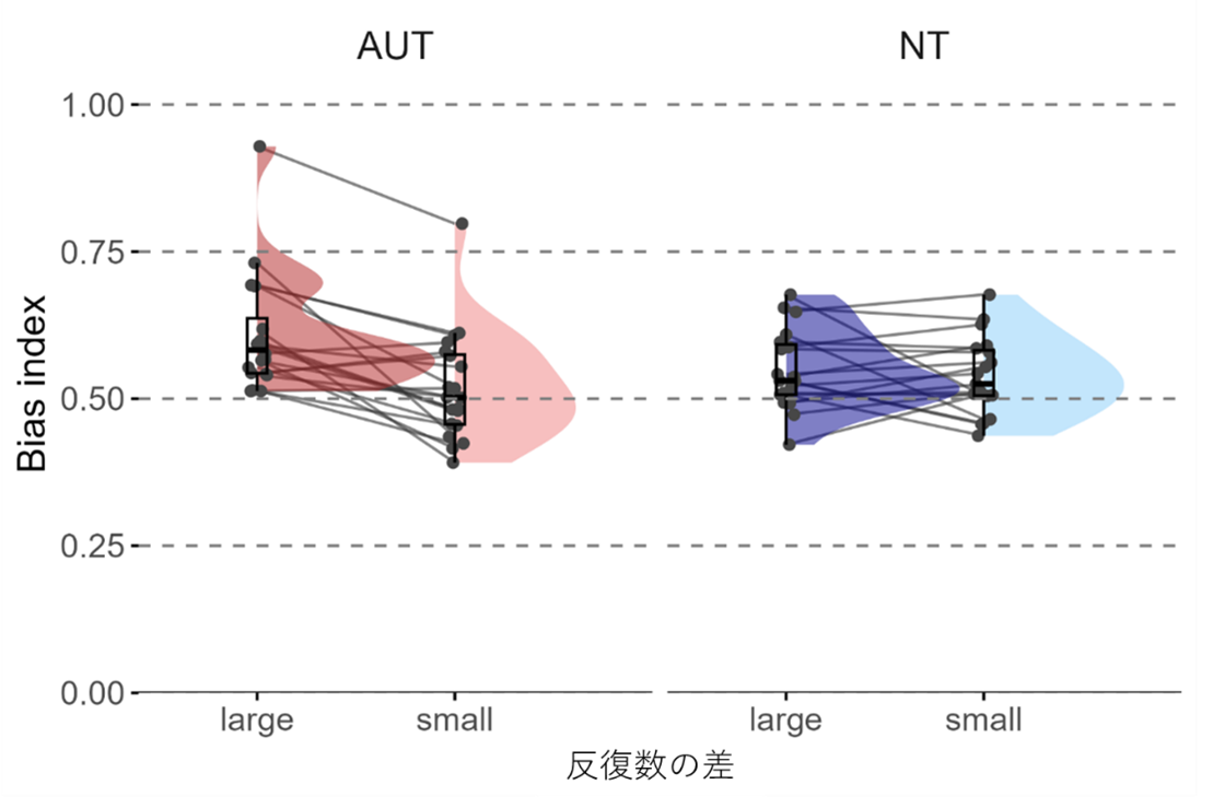 本研究では、アイトラッキング(視線計測)を用いて、AUT(ASD)群と定型発達(NT)群の注視行動を比較。その結果、AUT群は刺激間の相対的な複雑性の差が大きい条件において、反復性の高くより複雑な図形を有意に長く注視することが確認されました。